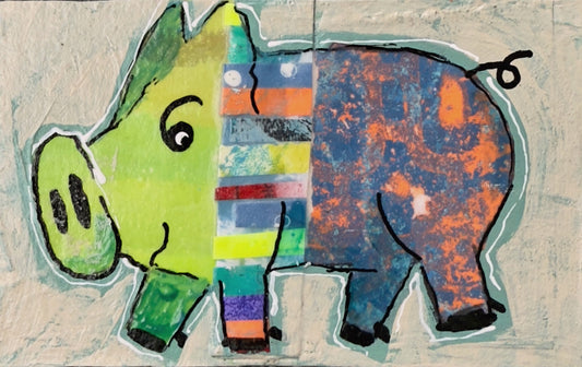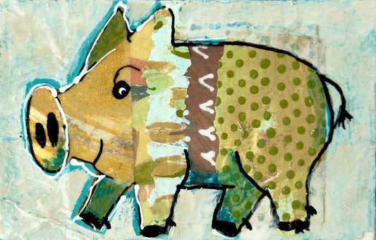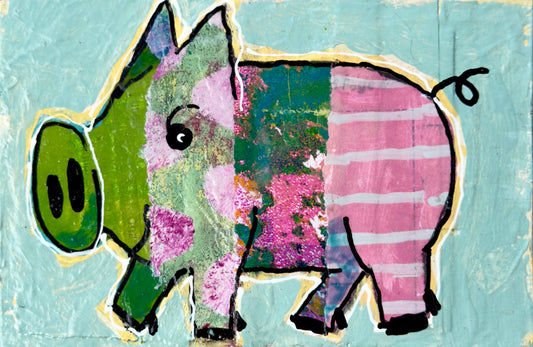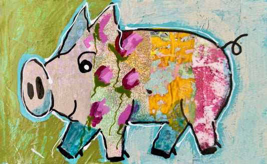Each piece is handcrafted by Anita Goff using upcycled materials and mounted on salvaged wood, making every pig unique in name, color, and character. No two are alike, just like the sanctuary babes that inspire them.
