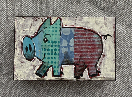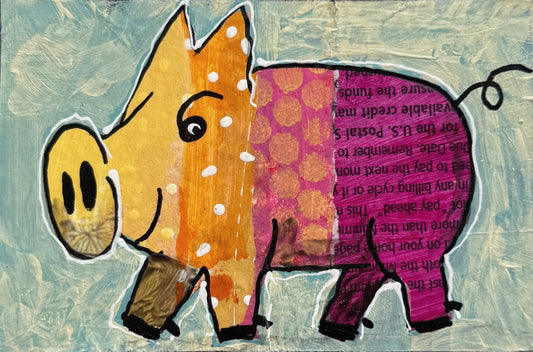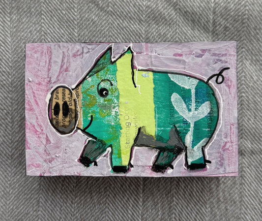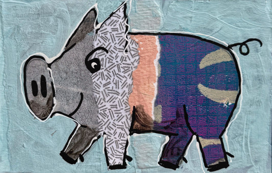 Each piece is handcrafted by Anita Goff using upcycled materials and mounted on salvaged wood, making every pig unique in name, color, and character. No two are alike, just like the sanctuary babes that inspire them.