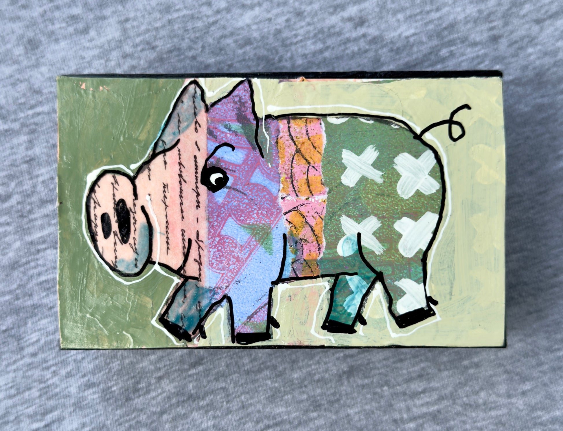 Description - These one-of-a-kind scrappy collage pigs are the perfect pop of personality for a shelf, windowsill, or wall (just add a Velcro Command Strip and you're set!). Each colorful piglet is crafted from hand-painted, recycled paper, lovingly collaged onto watercolor paper, then mounted on custom-cut, salvaged wood blocks. The sides are painted black with white polka dots and the bottom edge is signed by the artist. These blocks are a joyful mix of creativity and sustainability in one irresistible little package.