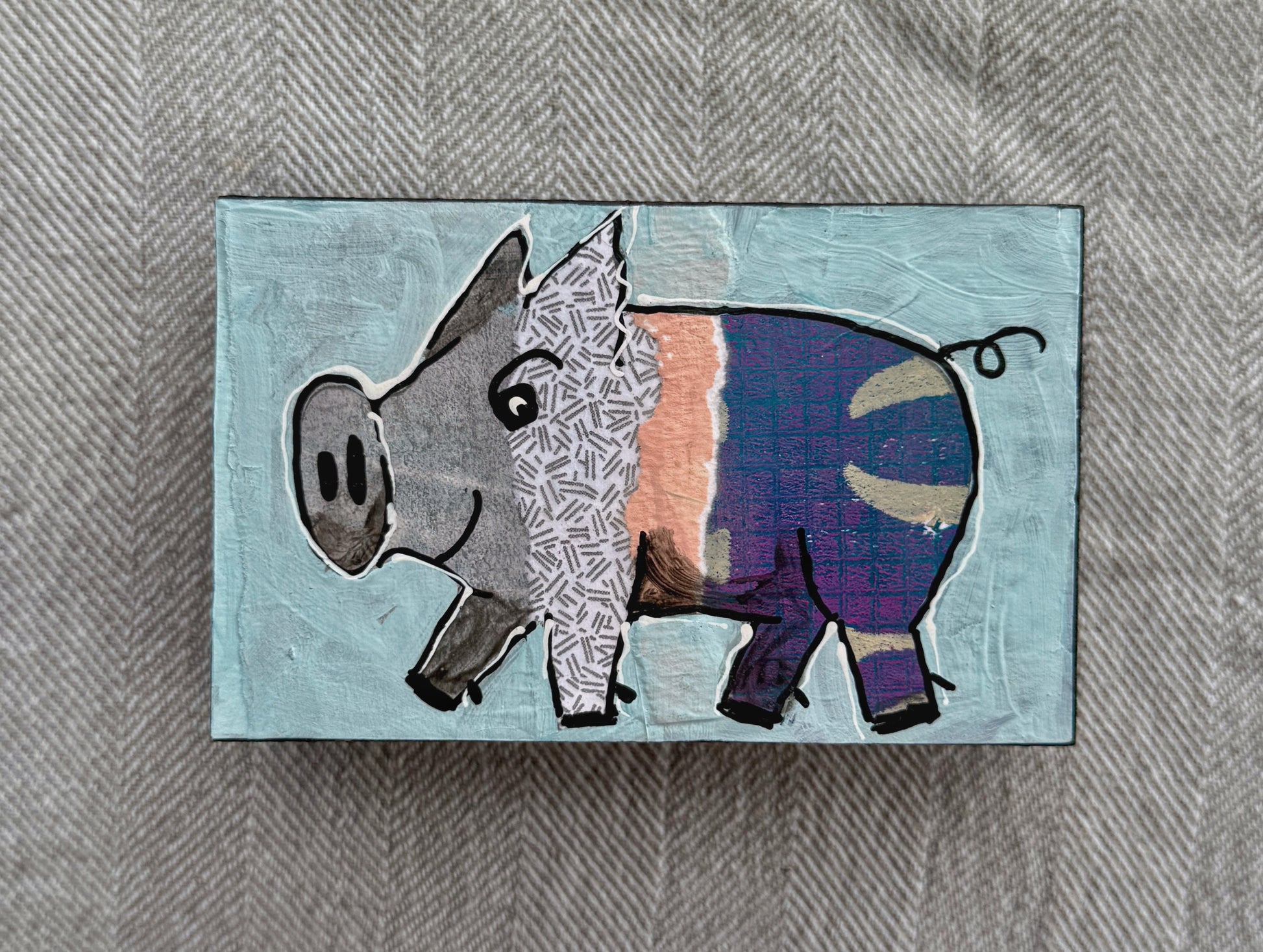 Description - These one-of-a-kind scrappy collage pigs are the perfect pop of personality for a shelf, windowsill, or wall (just add a Velcro Command Strip and you're set!). Each colorful piglet is crafted from hand-painted, recycled paper, lovingly collaged onto watercolor paper, then mounted on custom-cut, salvaged wood blocks. The sides are painted black with white polka dots and the bottom edge is signed by the artist. These blocks are a joyful mix of creativity and sustainability in one irresistible little package.