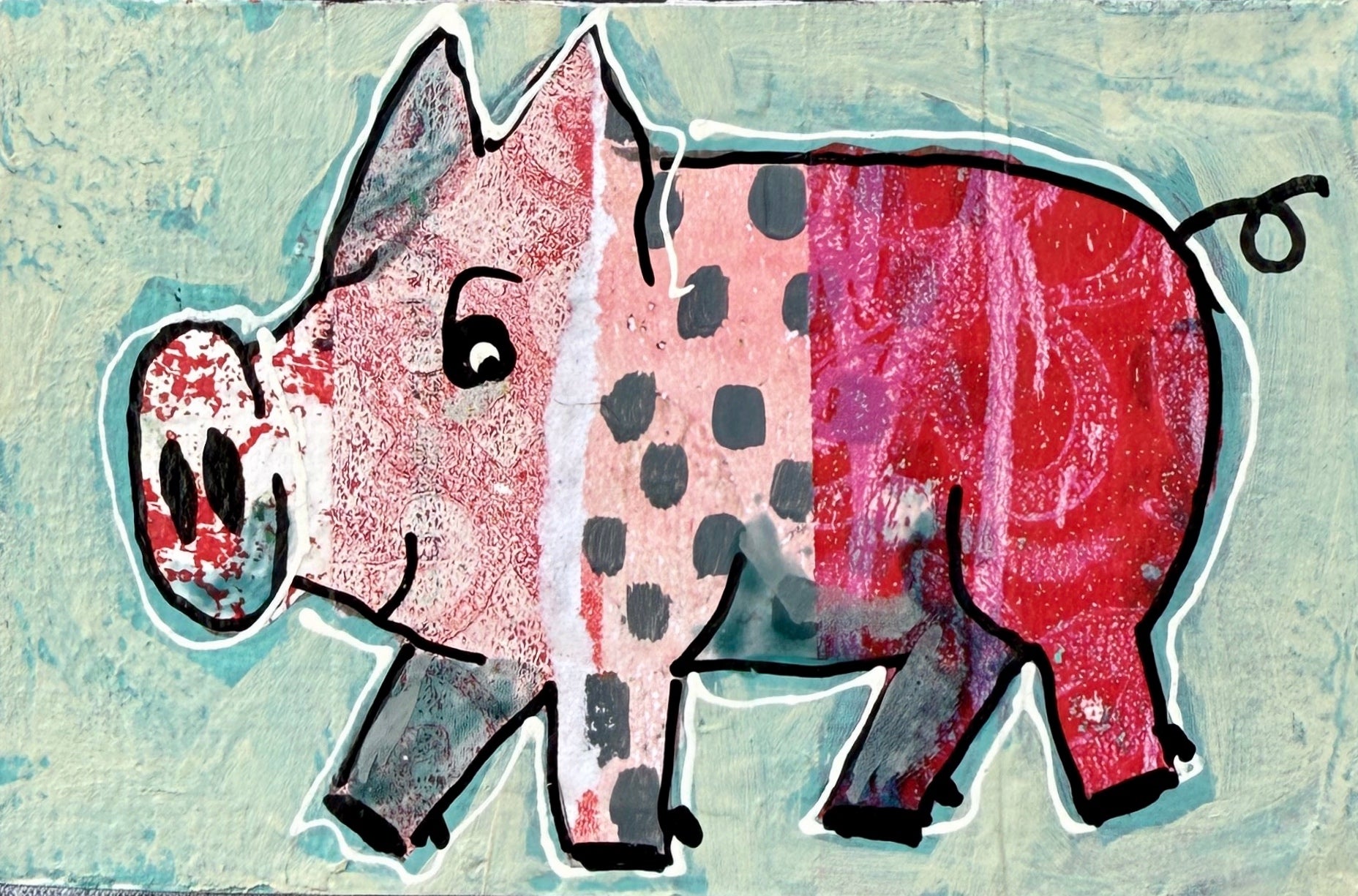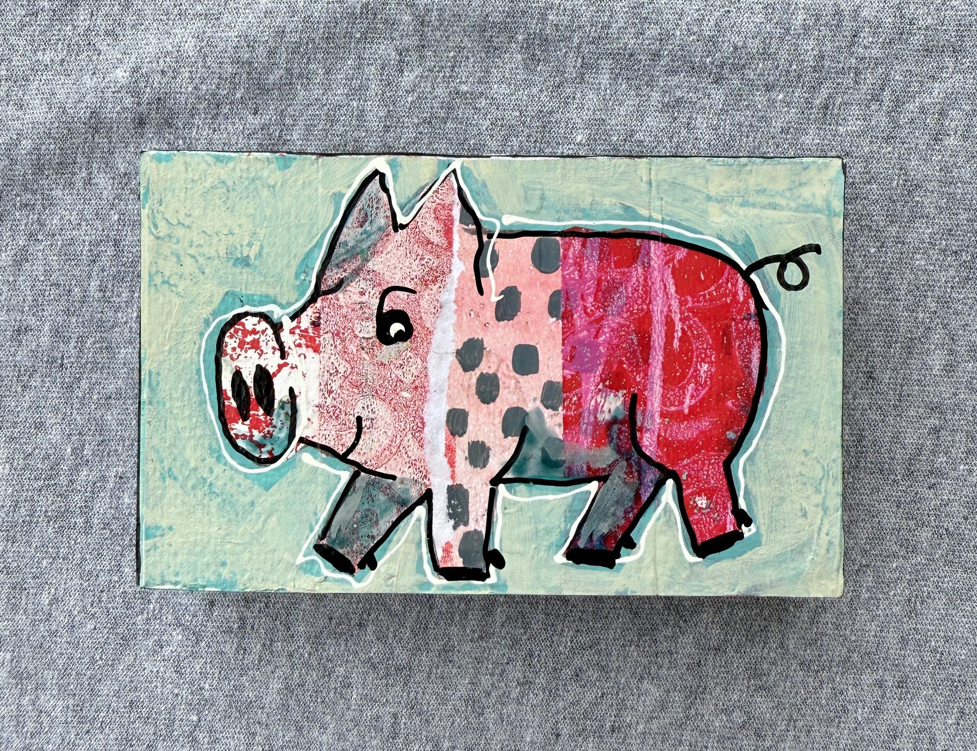 Description - These one-of-a-kind scrappy collage pigs are the perfect pop of personality for a shelf, windowsill, or wall (just add a Velcro Command Strip and you're set!). Each colorful piglet is crafted from hand-painted, recycled paper, lovingly collaged onto watercolor paper, then mounted on custom-cut, salvaged wood blocks. The sides are painted black with white polka dots and the bottom edge is signed by the artist. These blocks are a joyful mix of creativity and sustainability in one irresistible little package.