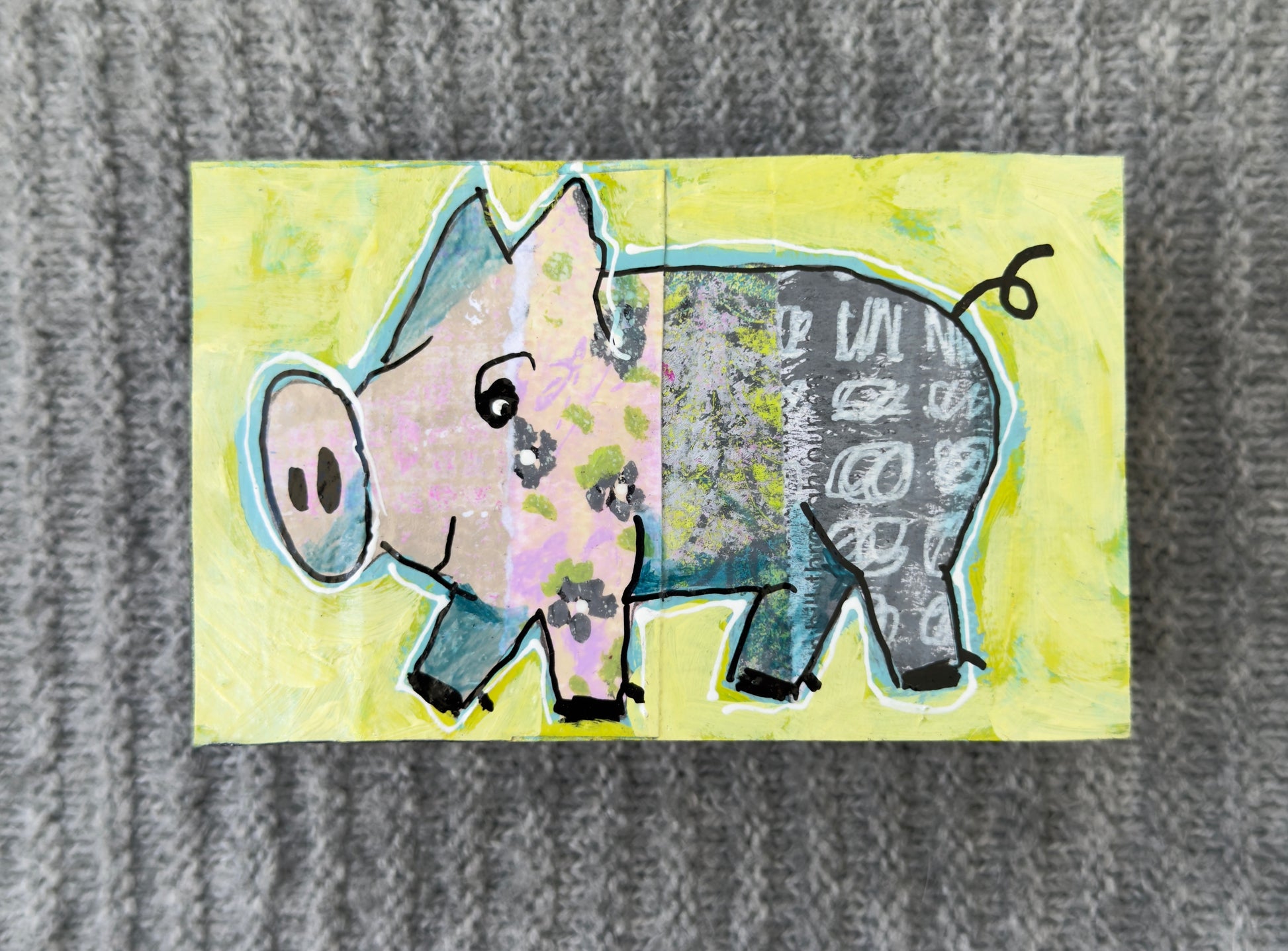Description - These one-of-a-kind scrappy collage pigs are the perfect pop of personality for a shelf, windowsill, or wall (just add a Velcro Command Strip and you're set!). Each colorful piglet is crafted from hand-painted, recycled paper, lovingly collaged onto watercolor paper, then mounted on custom-cut, salvaged wood blocks. The sides are painted black with white polka dots and the bottom edge is signed by the artist. These blocks are a joyful mix of creativity and sustainability in one irresistible little package.
