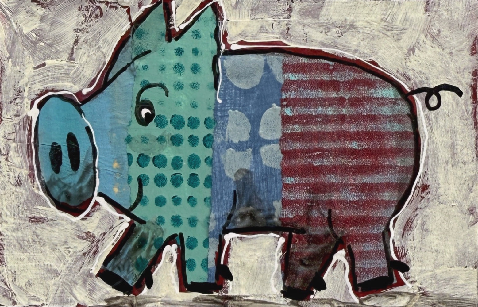 The 2025 Collage Pigs collection features one-of-a-kind, scrappy pig portraits bursting with personality and vibrant colors. Each piece is handcrafted by Anita Goff using upcycled materials and mounted on salvaged wood, making every pig unique in name, color, and character. No two are alike, just like the sanctuary babes that inspire them.
