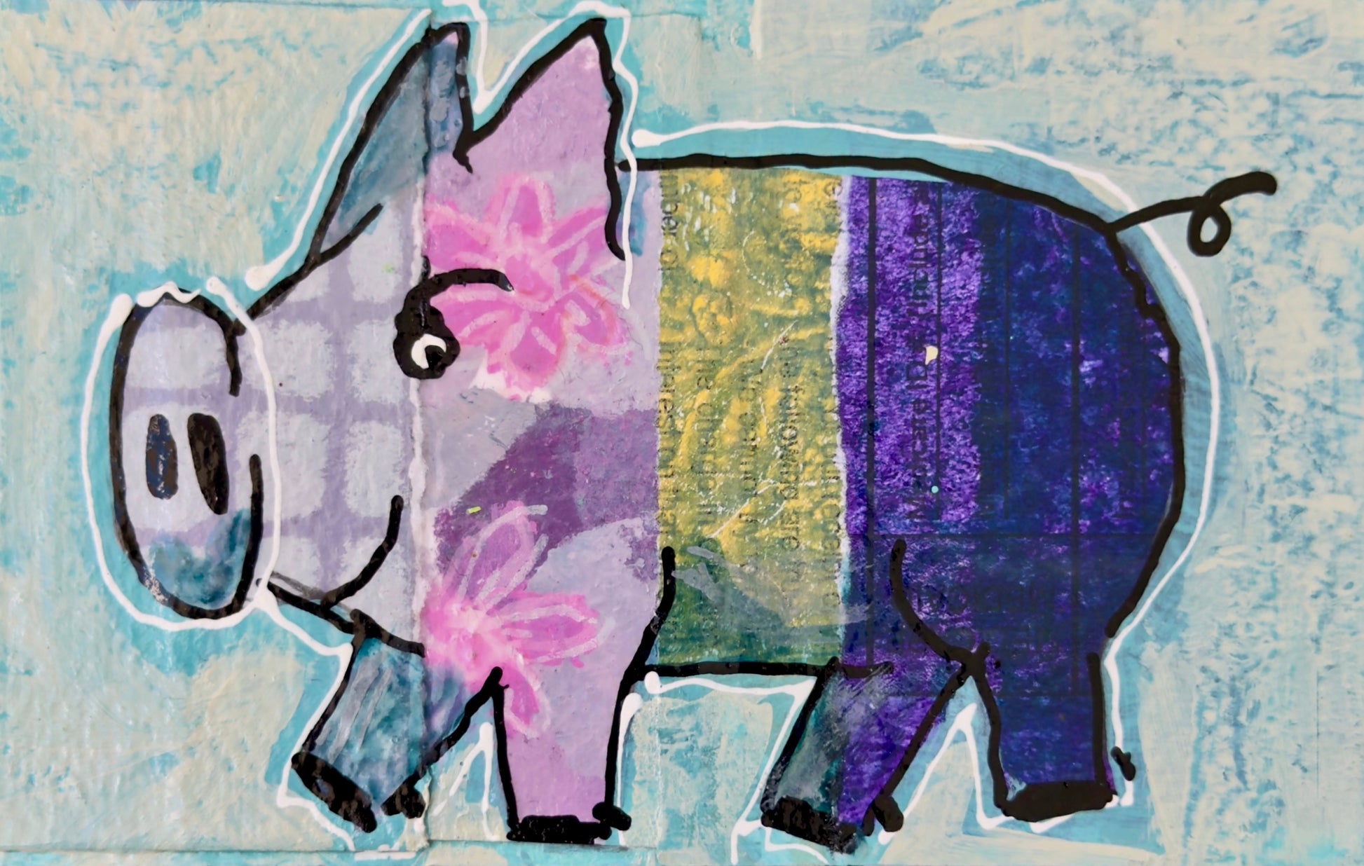 Description - These one-of-a-kind scrappy collage pigs are the perfect pop of personality for a shelf, windowsill, or wall (just add a Velcro Command Strip and you're set!). Each colorful piglet is crafted from hand-painted, recycled paper, lovingly collaged onto watercolor paper, then mounted on custom-cut, salvaged wood blocks. The sides are painted black with white polka dots and the bottom edge is signed by the artist. These blocks are a joyful mix of creativity and sustainability in one irresistible little package.