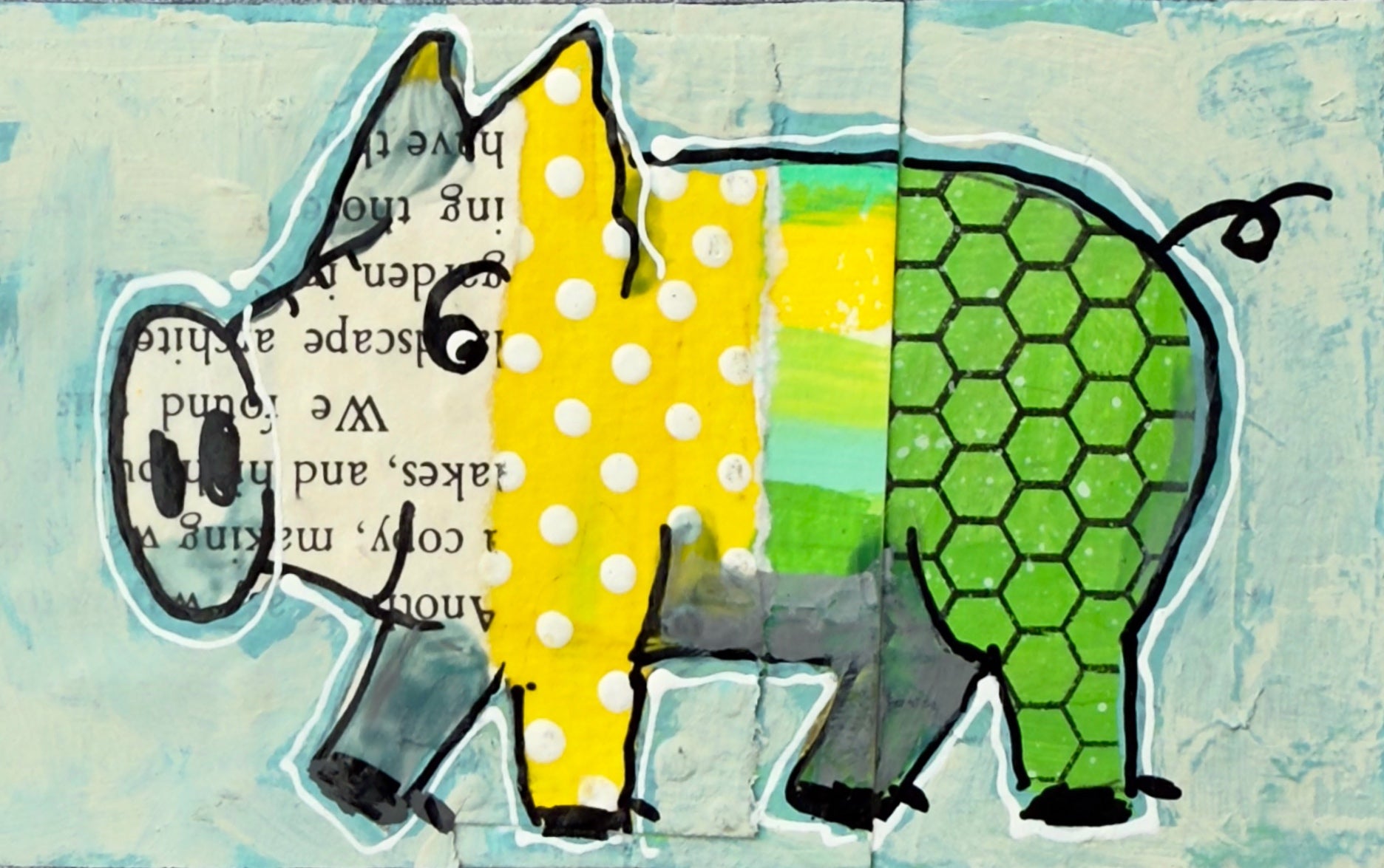 The 2025 Collage Pigs collection features one-of-a-kind, scrappy pig portraits bursting with personality and vibrant colors. Each piece is handcrafted by Anita Goff using upcycled materials and mounted on salvaged wood, making every pig unique in name, color, and character. No two are alike, just like the sanctuary babes that inspire them.