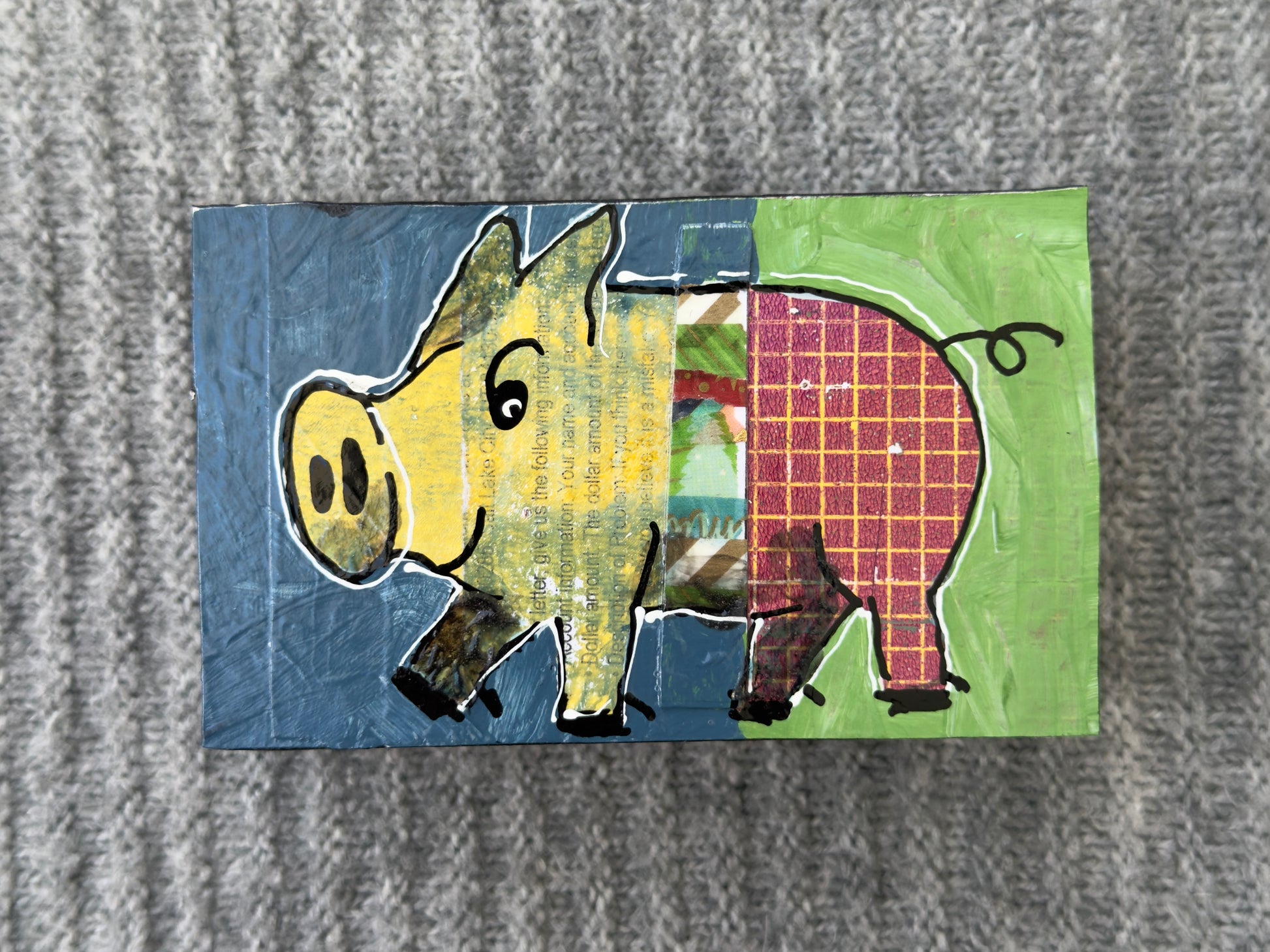 Description - These one-of-a-kind scrappy collage pigs are the perfect pop of personality for a shelf, windowsill, or wall (just add a Velcro Command Strip and you're set!). Each colorful piglet is crafted from hand-painted, recycled paper, lovingly collaged onto watercolor paper, then mounted on custom-cut, salvaged wood blocks. The sides are painted black with white polka dots and the bottom edge is signed by the artist. These blocks are a joyful mix of creativity and sustainability in one irresistible little package.