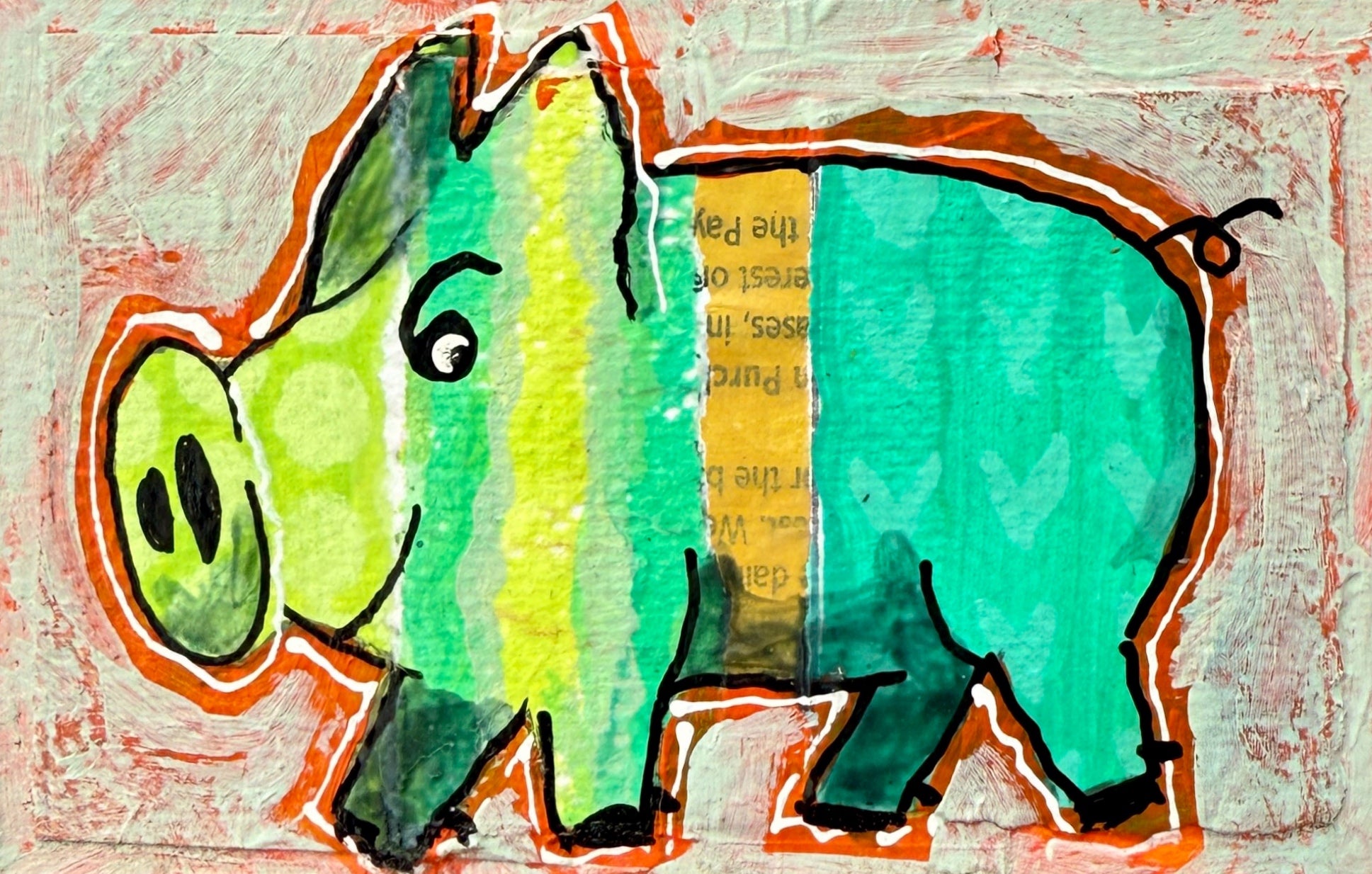 Description - These one-of-a-kind scrappy collage pigs are the perfect pop of personality for a shelf, windowsill, or wall (just add a Velcro Command Strip and you're set!). Each colorful piglet is crafted from hand-painted, recycled paper, lovingly collaged onto watercolor paper, then mounted on custom-cut, salvaged wood blocks. The sides are painted black with white polka dots and the bottom edge is signed by the artist. These blocks are a joyful mix of creativity and sustainability in one irresistible little package.