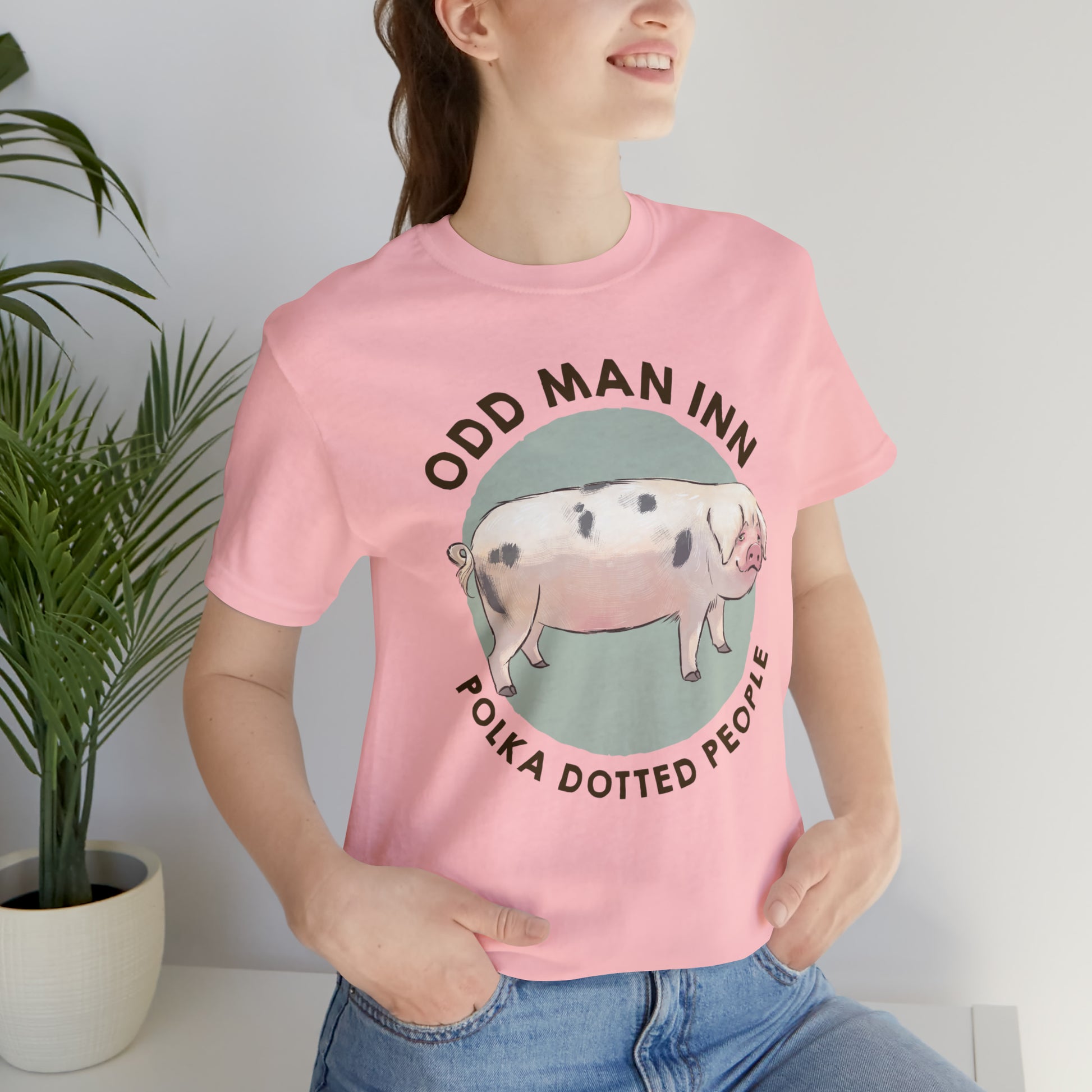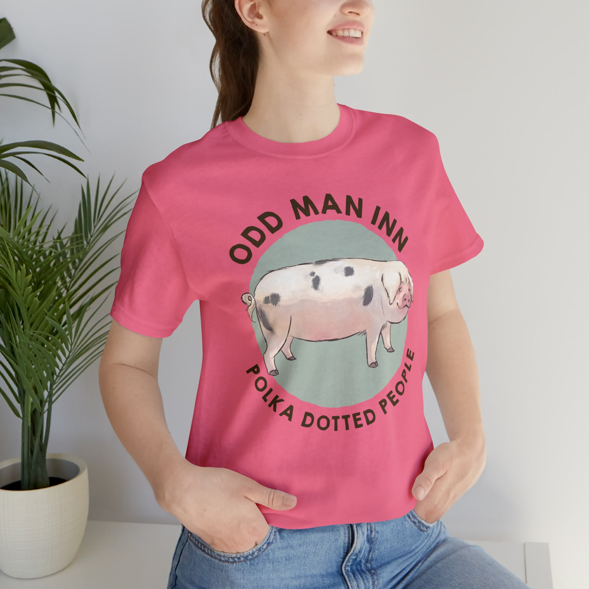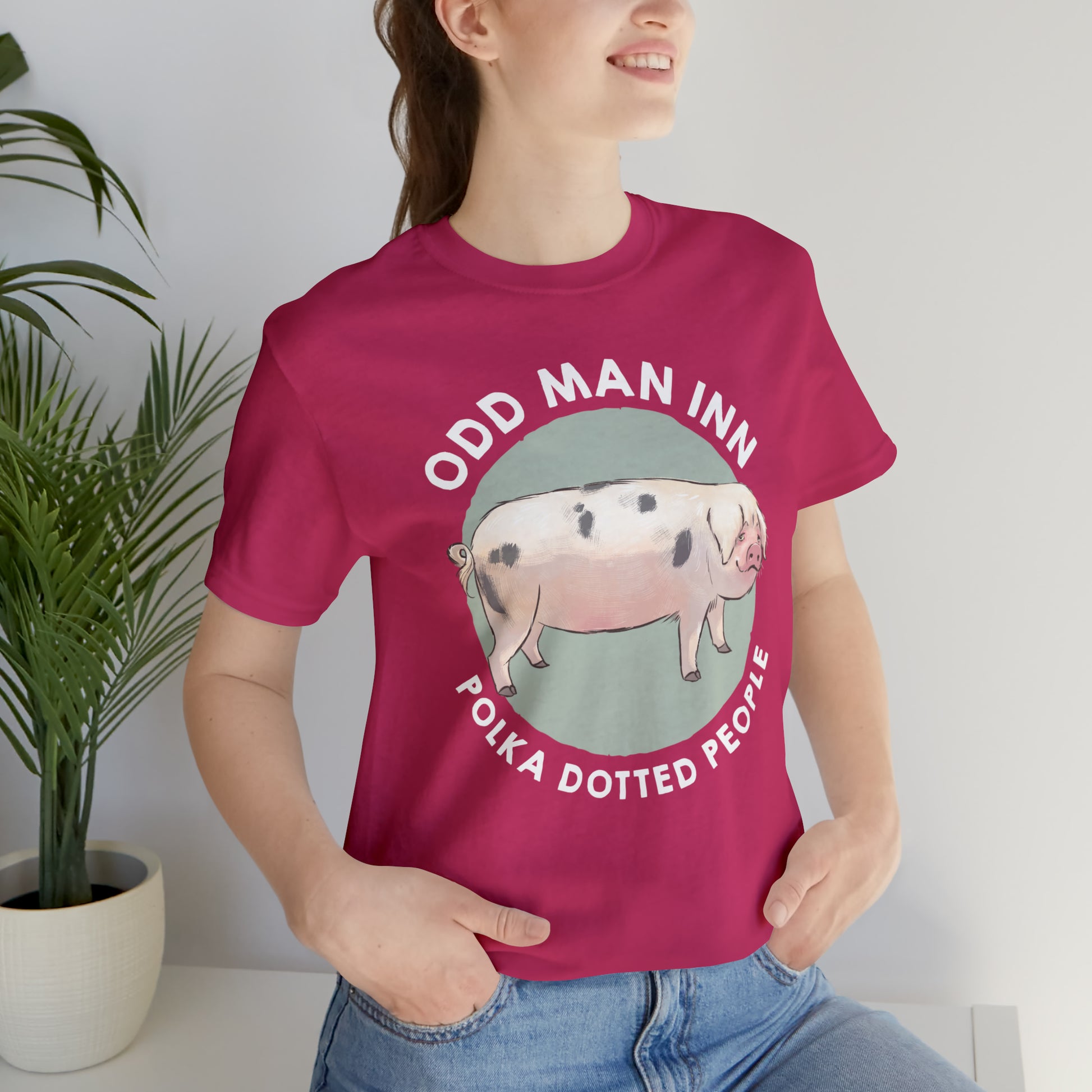 Show your love for Spot-tacular Oliver and his fellow Gloucestershire Old Spots People with this classic unisex jersey short-sleeve tee. Crafted from the softest 100% Airlume combed and ringspun cotton, this shirt features a commissioned illustration by Mor Spicer a talented vegan artist of BarkPoint Studio